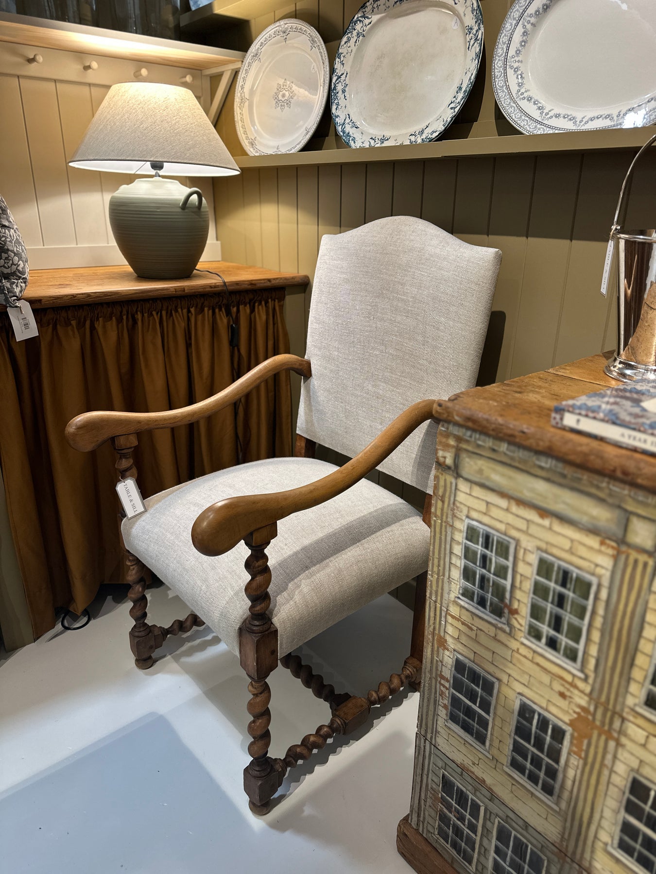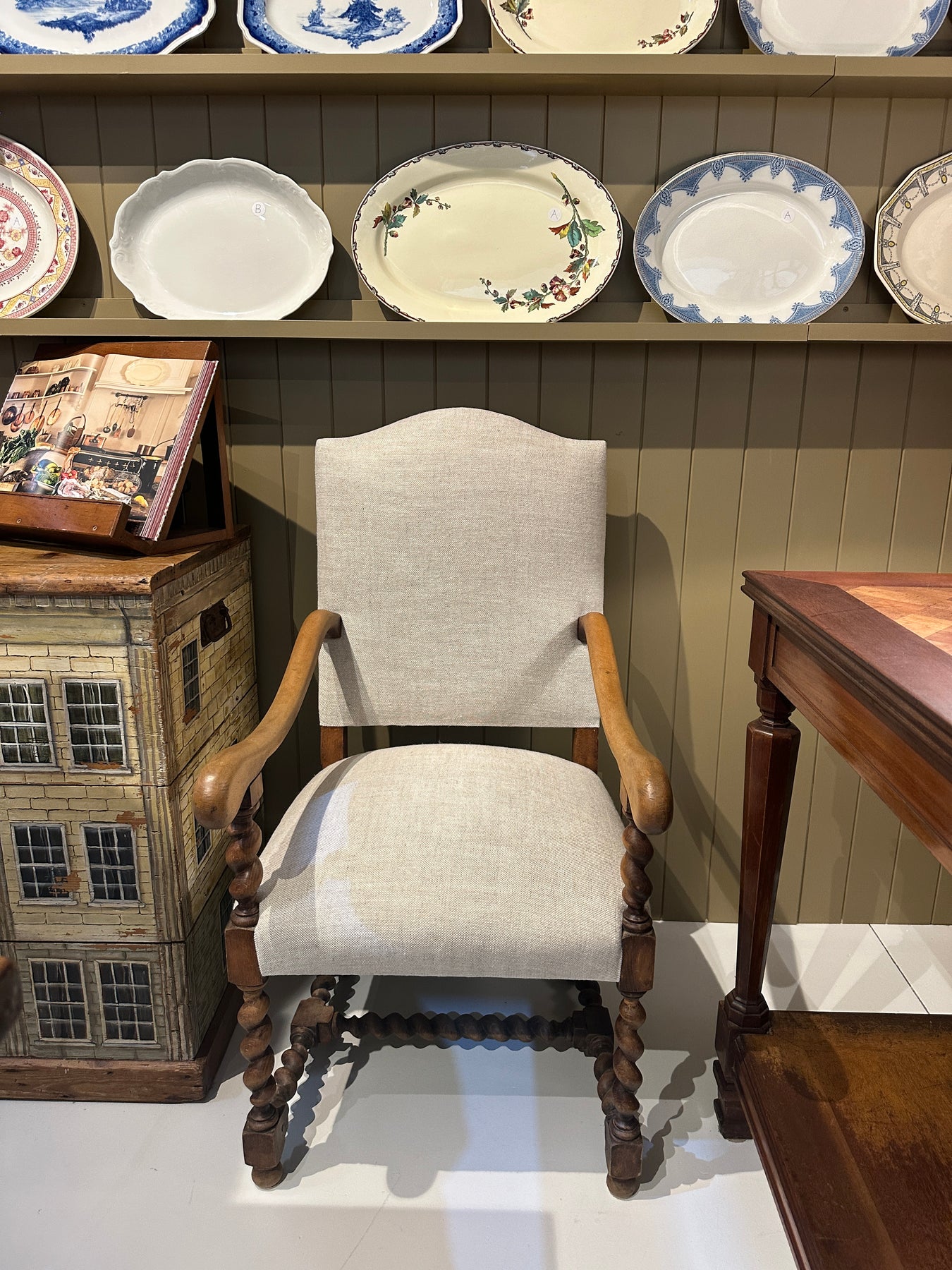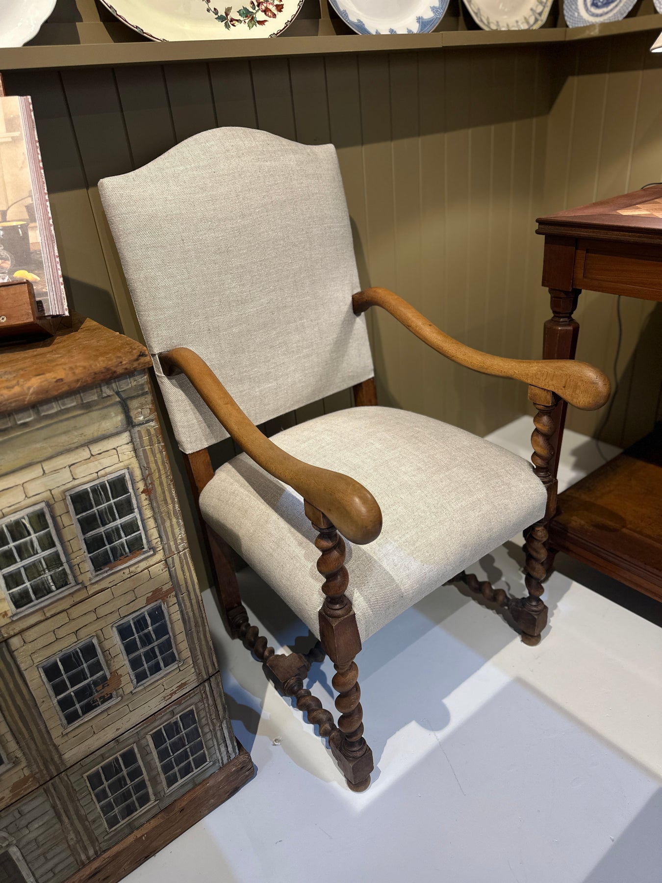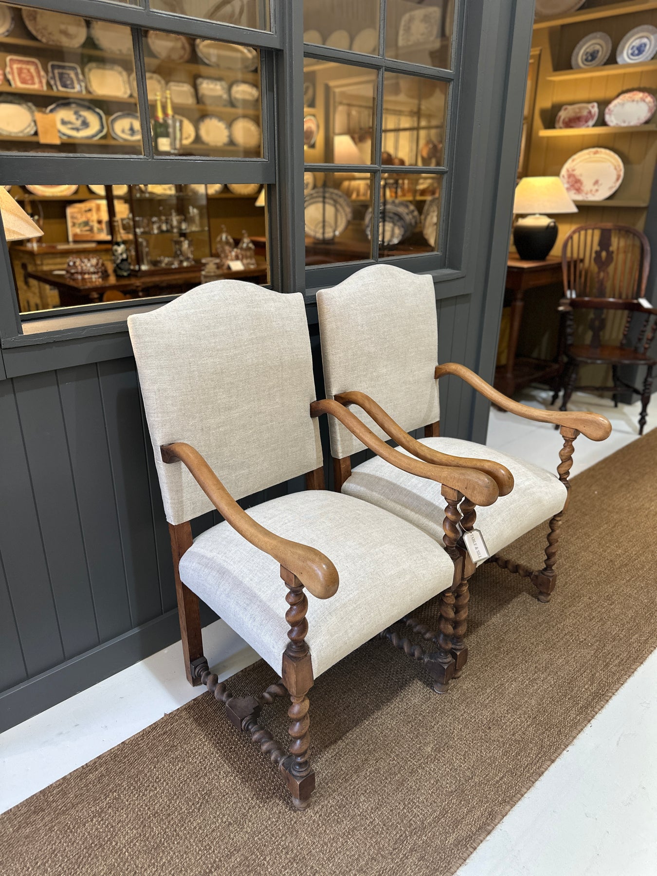 A wonderful pair of French antique classics! Newly reupholstered in a neutral/natural 100% Belgian Linen. The light oak is perfection - with butter smooth arms and barley twist legs, they're great to sit in and look at! They're a lovely heavy weight.