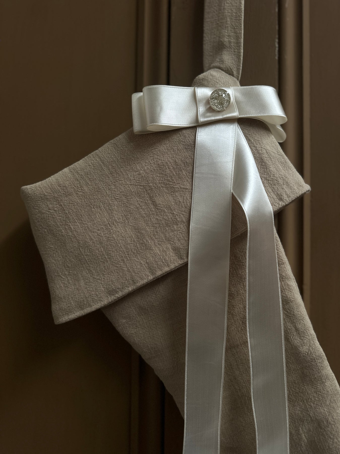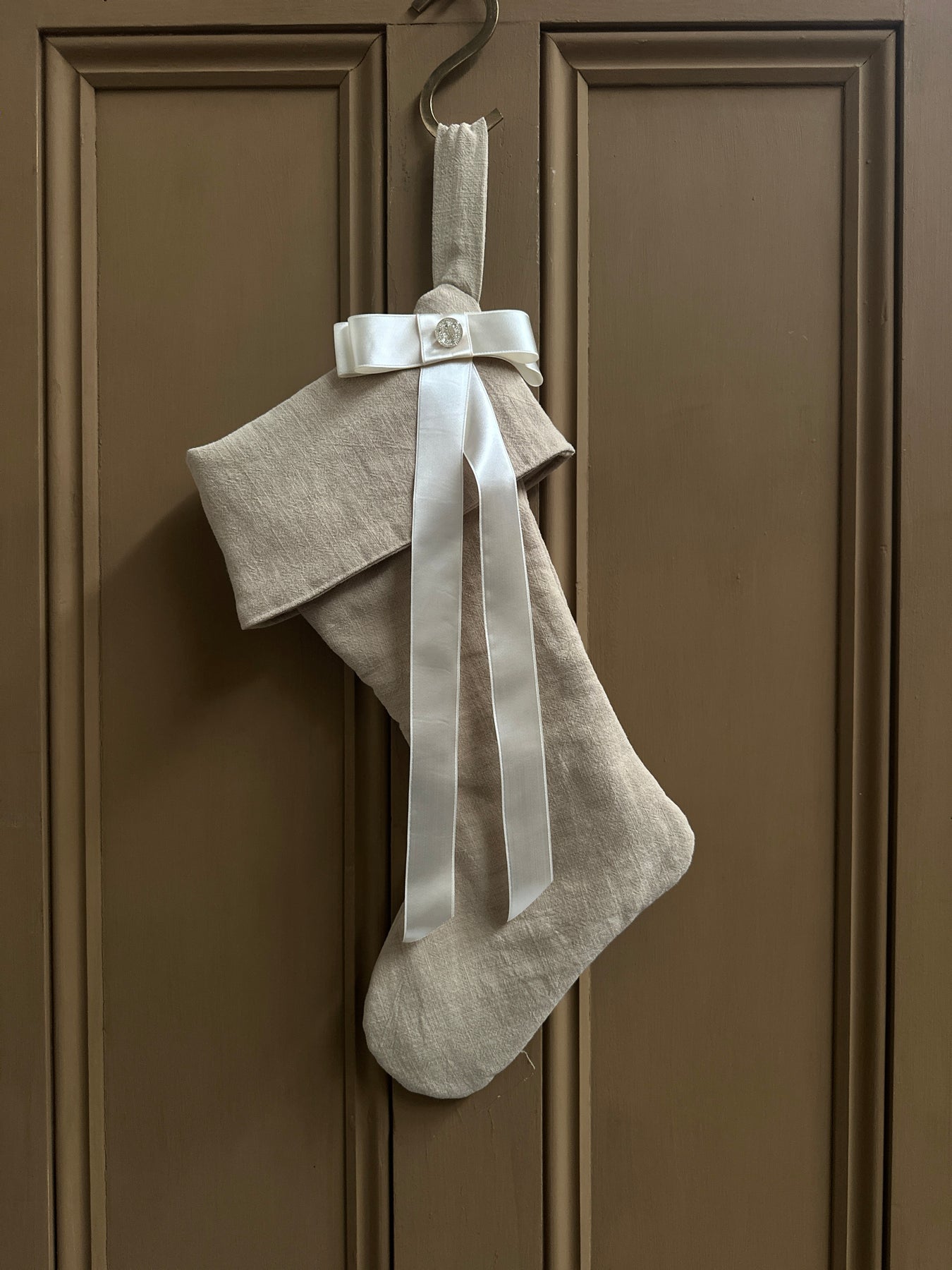 Handmade Christmas stockings made from a wool lined, linen mix fabric with vintage English satin ribbon and a vintage Czech glass button.